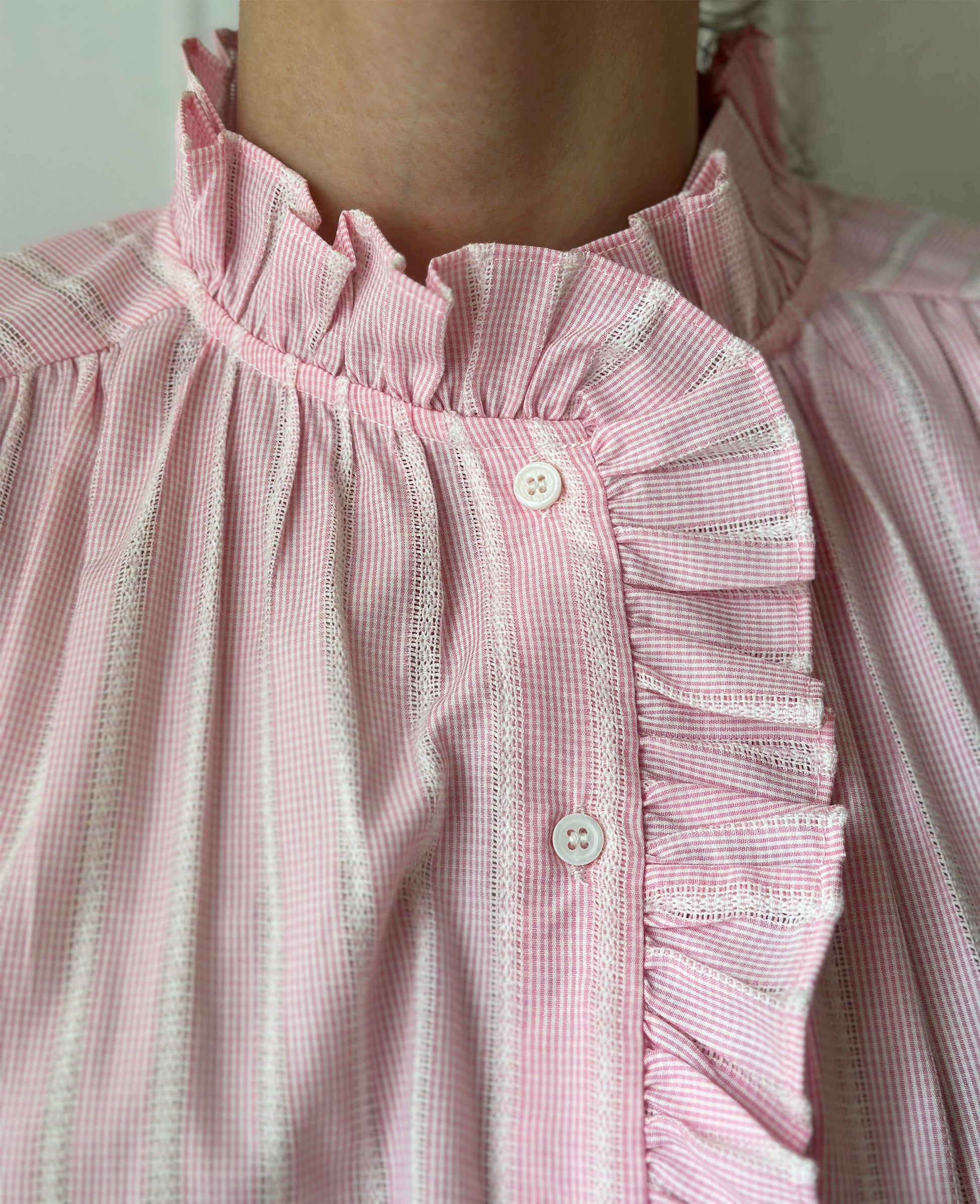 Craquez pour la blouse Zoelie par son allure romantique dans un tissu léger à fines rayures roses et blanches. Elle se distingue par ses jolis volants, son col montant. Une pièce élégante et intemporelle.