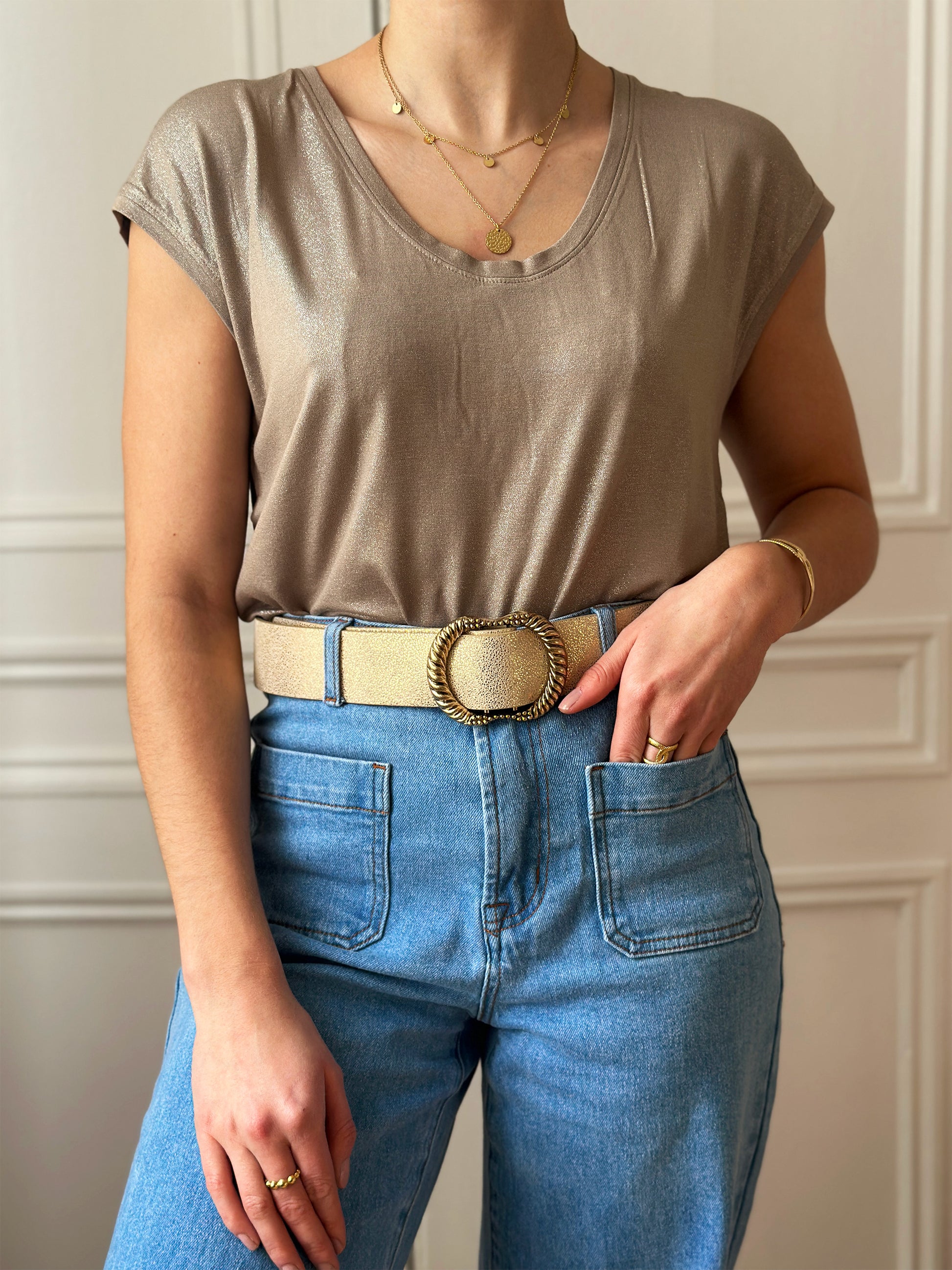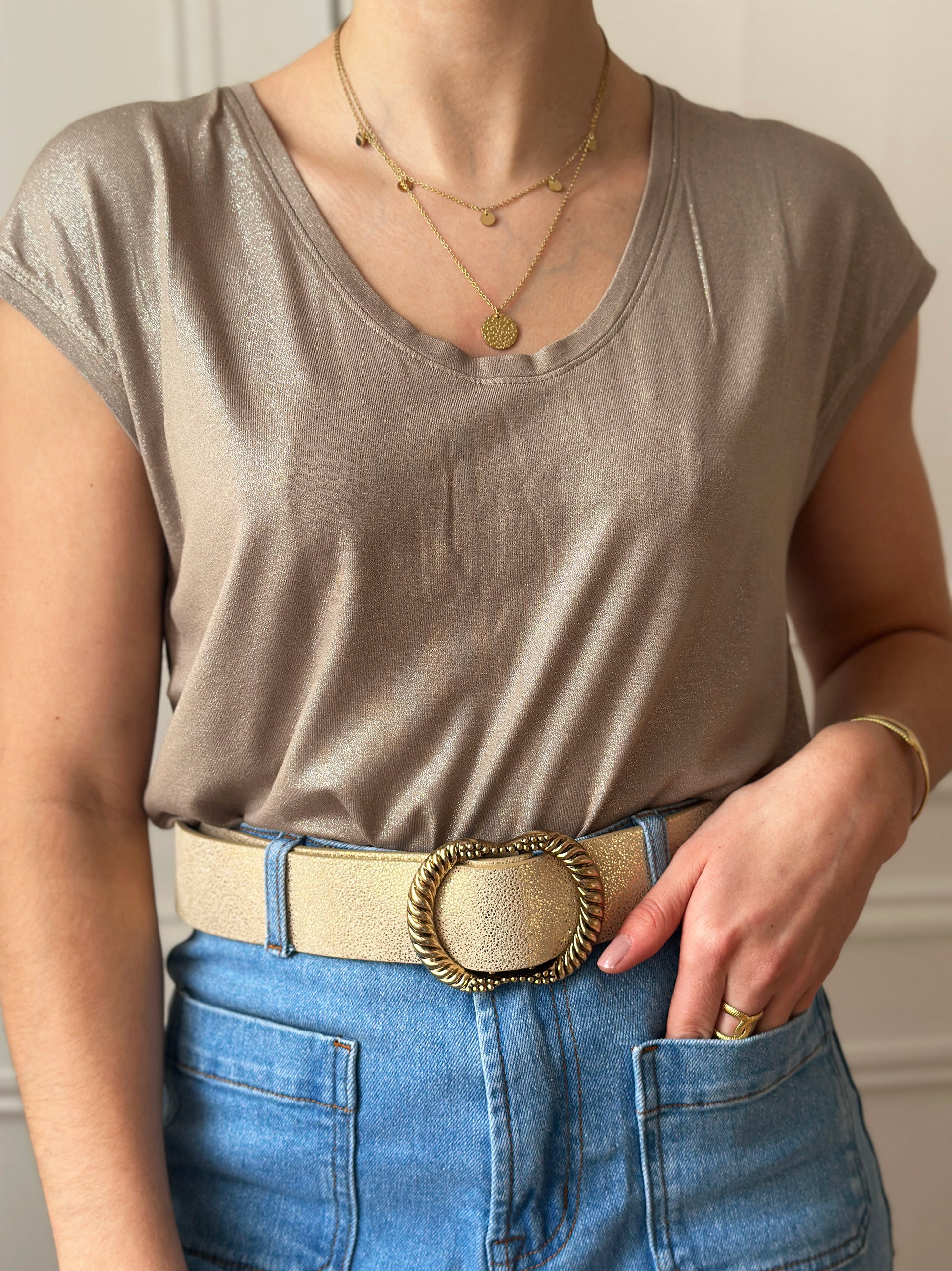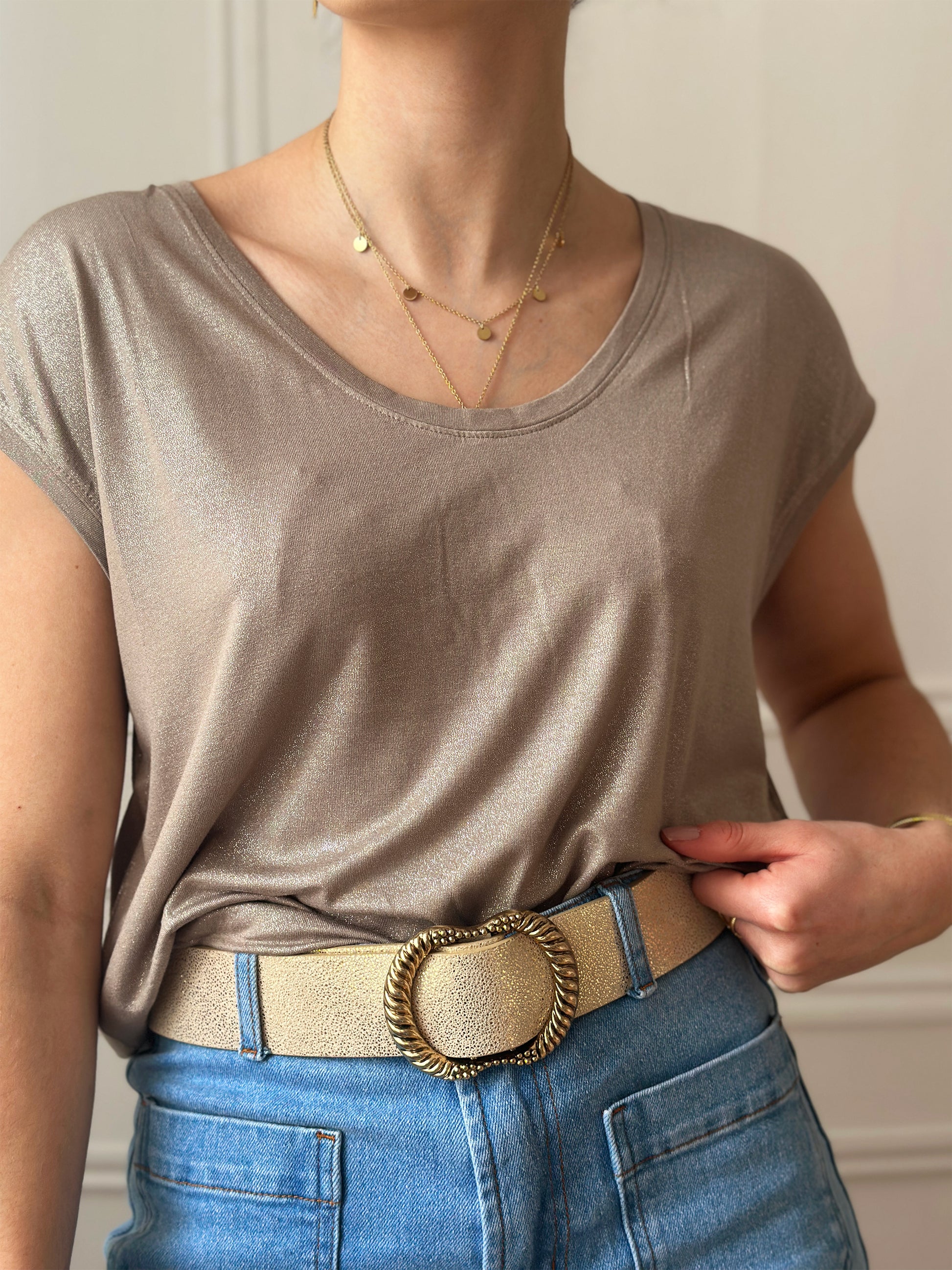 Le t-shirt Alex est un indispensable pensé pour accompagner vos journées avec style. Son coloris greige aux reflets lumineux pour un rendu chic et naturel !