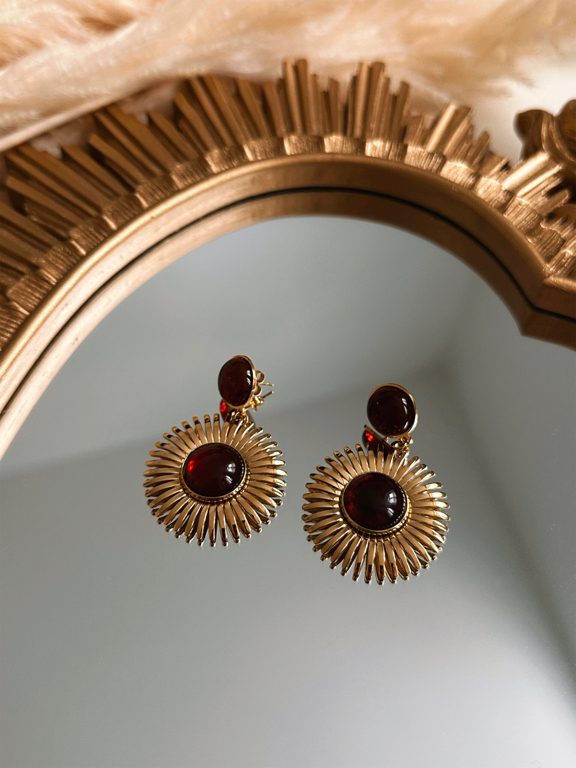 Nos boucles d’oreilles Calypso sont de vraies petites merveilles, elles se portent au quotidien comme en soirée ! Avec leur design rayonnant façon soleil et leur pierre effet ambré au centre, elles apportent une touche bohème chic et lumineuse à votre look.