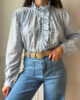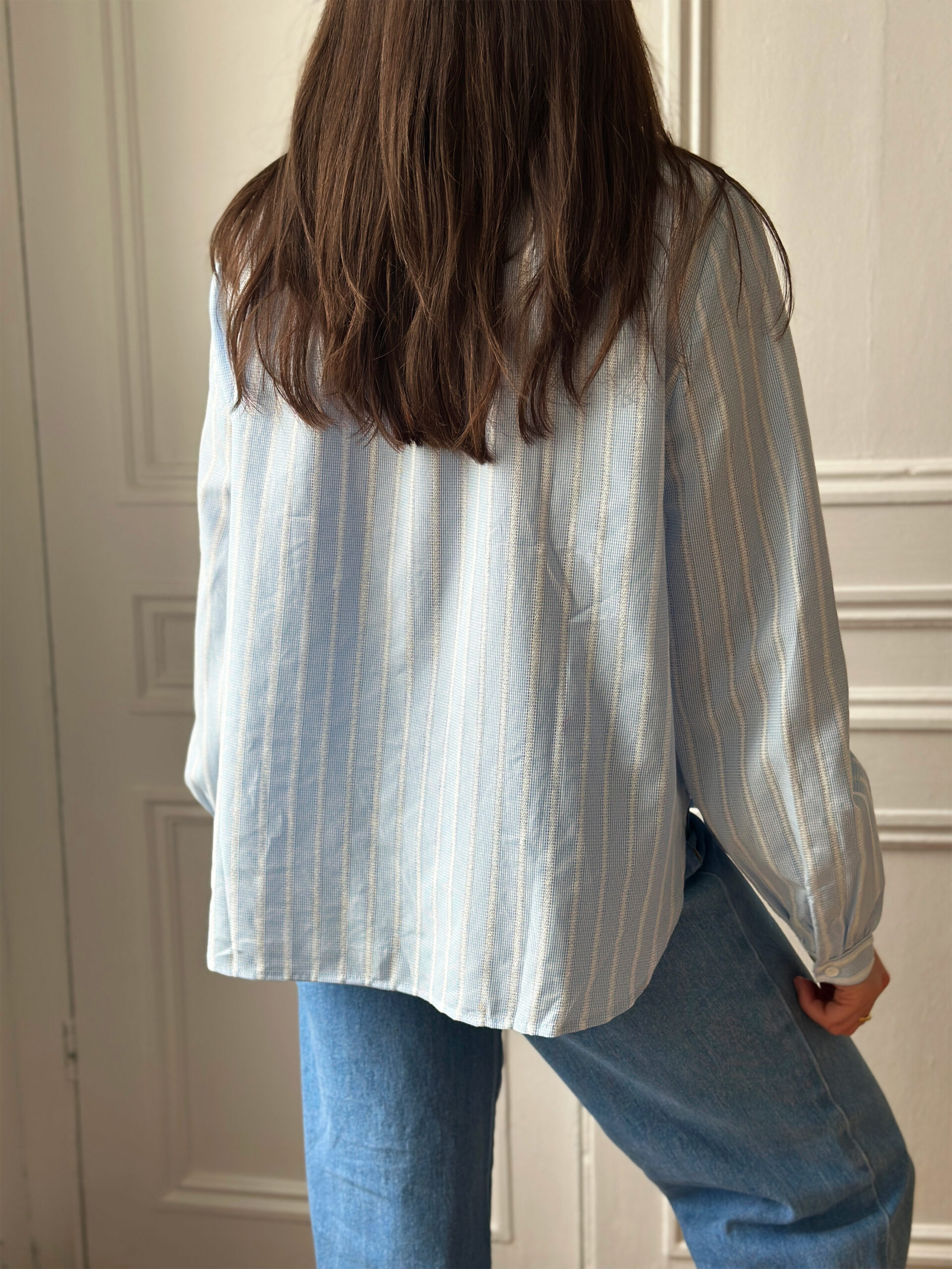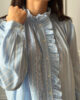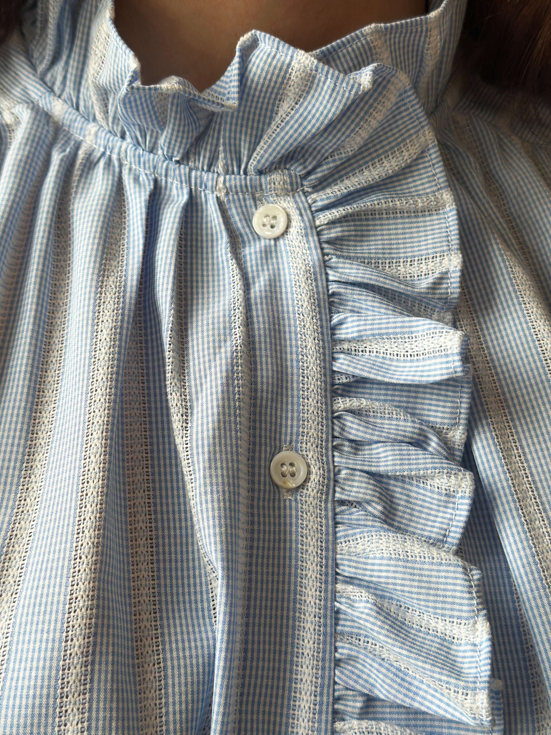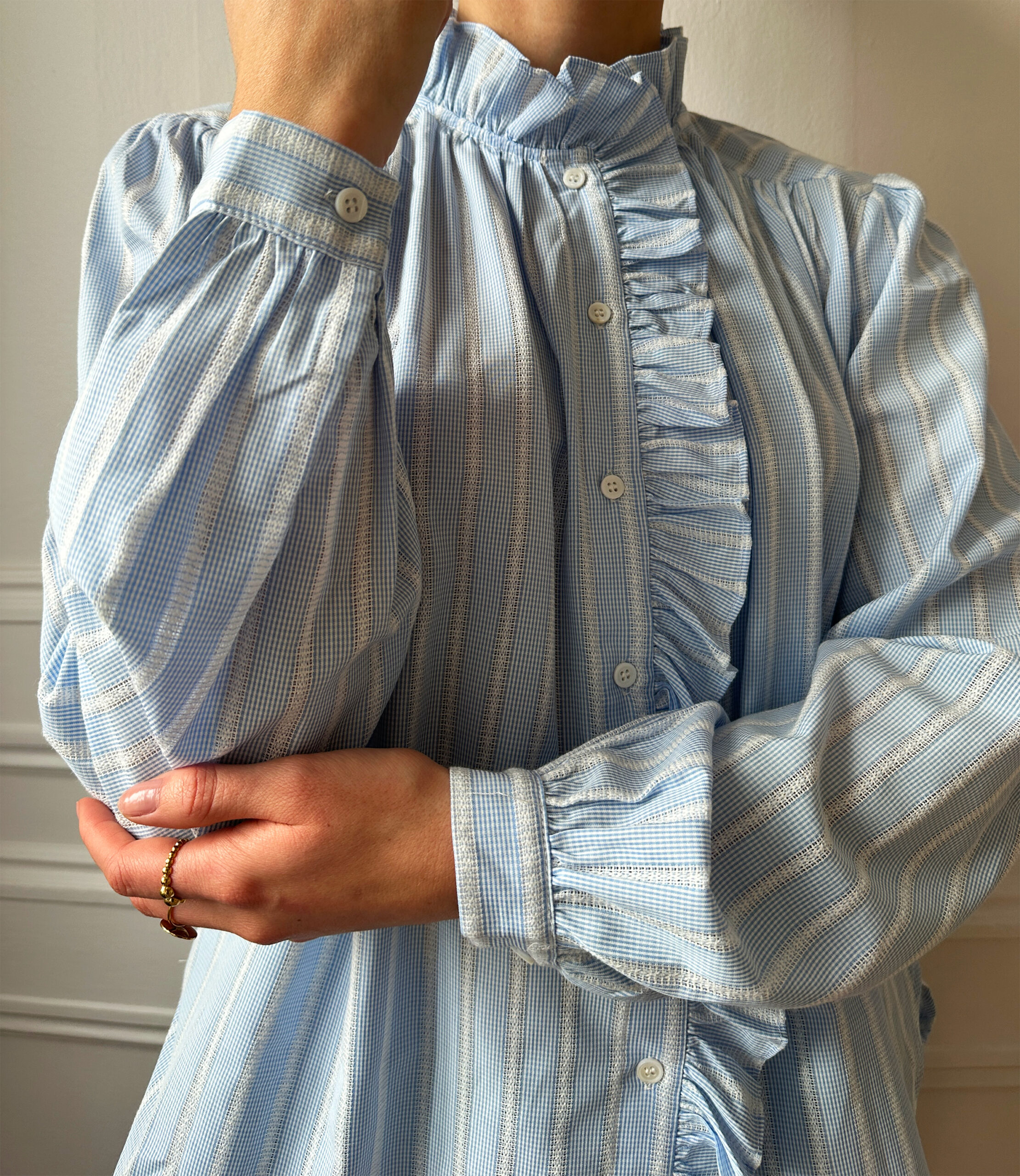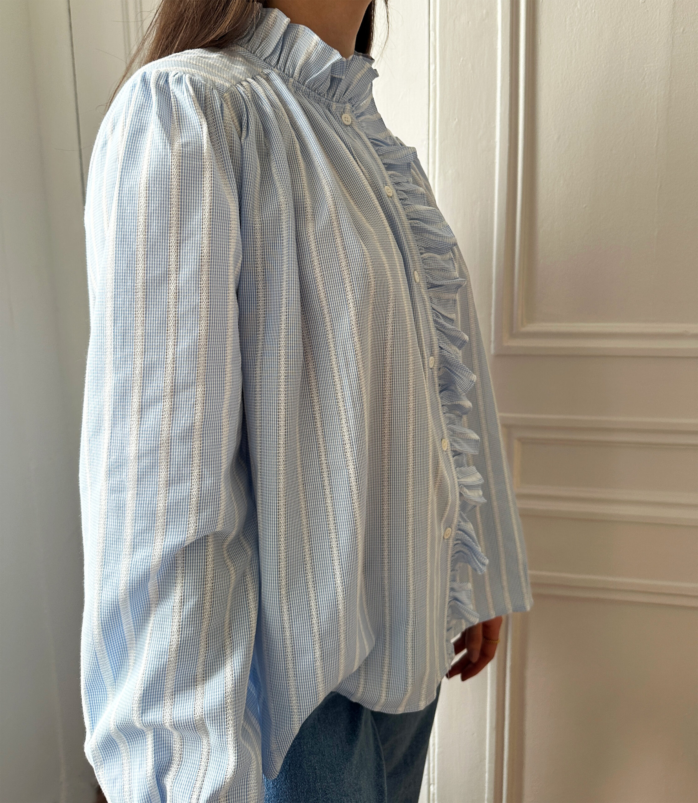 Craquez pour la blouse Zoelie par son allure romantique dans un tissu léger à fines rayures bleu ciel et blanches. Elle se distingue par ses jolis volants, son col montant. Une pièce élégante et intemporelle.