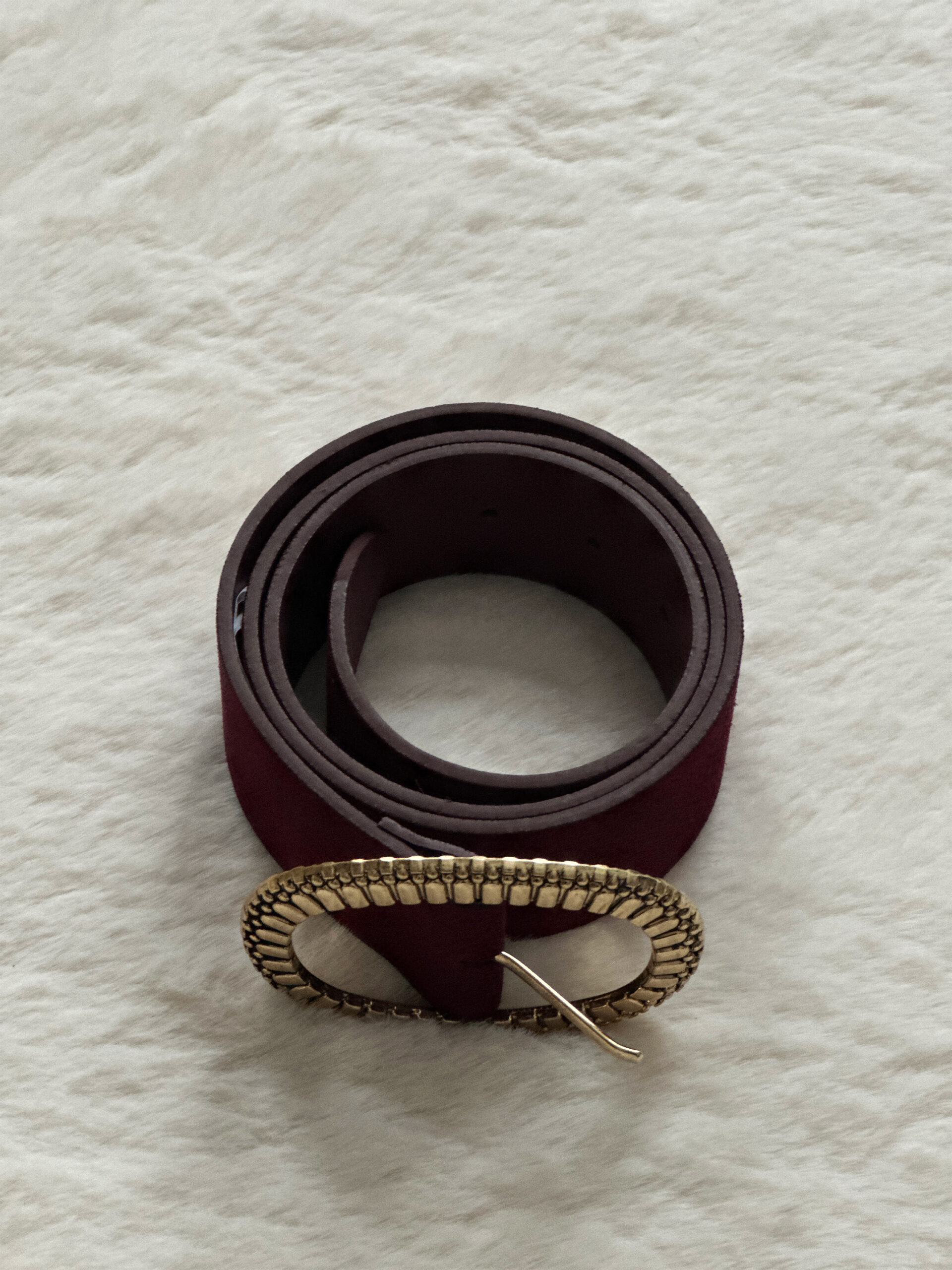 Apportez une touche d’élégance intemporelle à votre tenue avec la Ceinture LUANE, notre ceinture en cuir bordeaux, ornée d’une boucle dorée à l’aspect vieilli, au design raffiné et texturé.