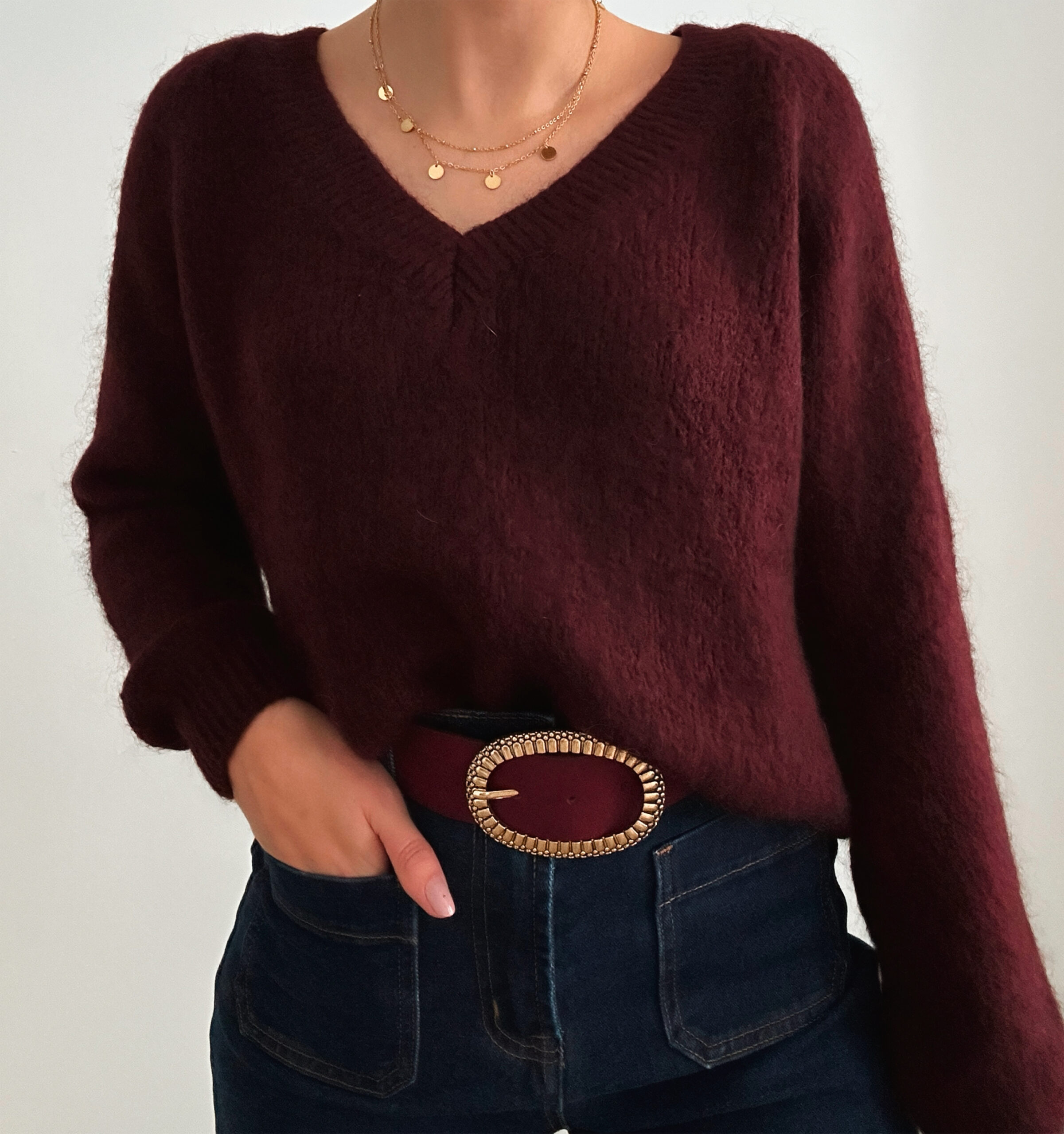 Voici Chloé, notre pull coup de cœur dans une douce teinte bordeaux et un joli décolleté en V.