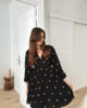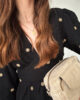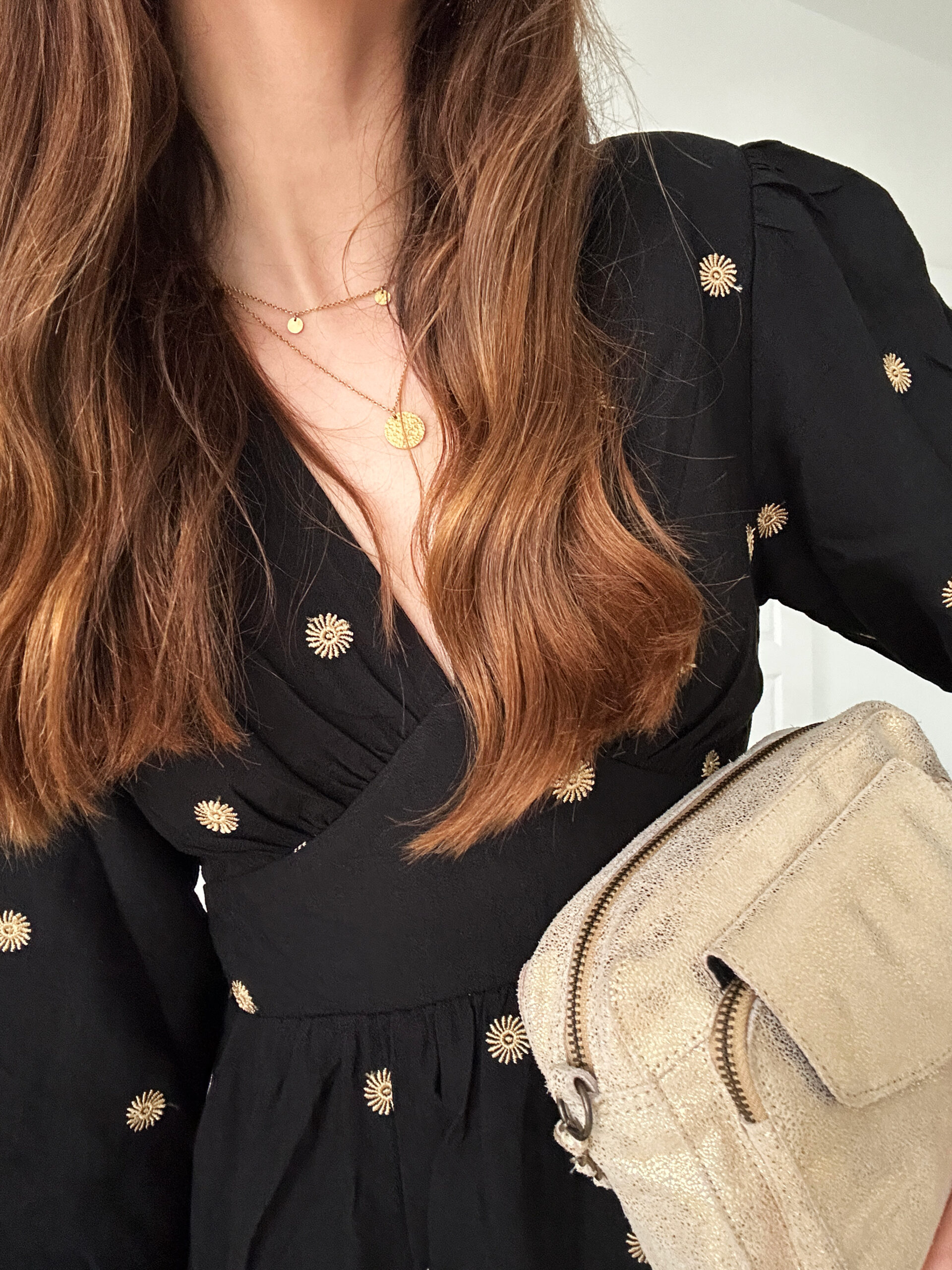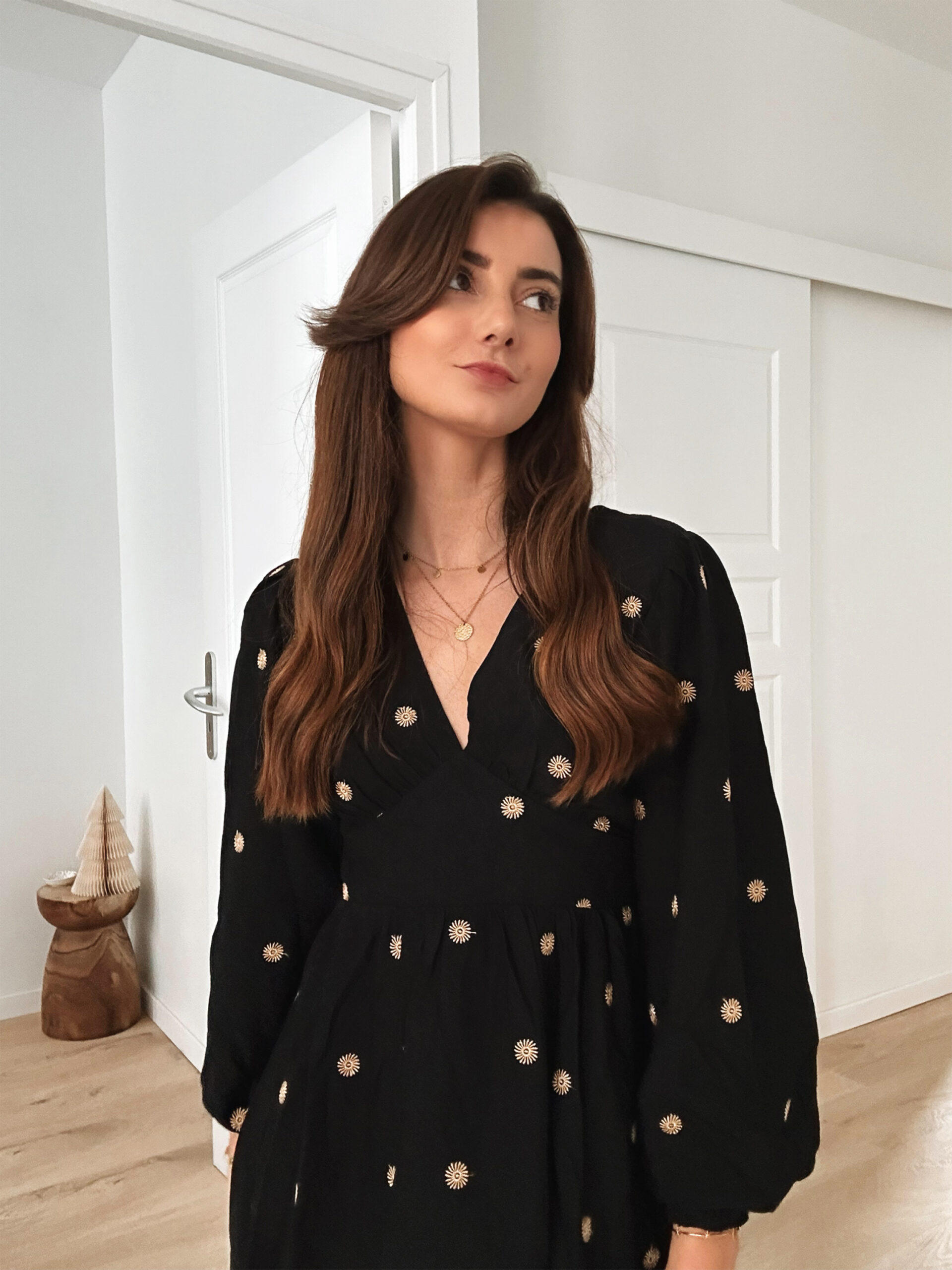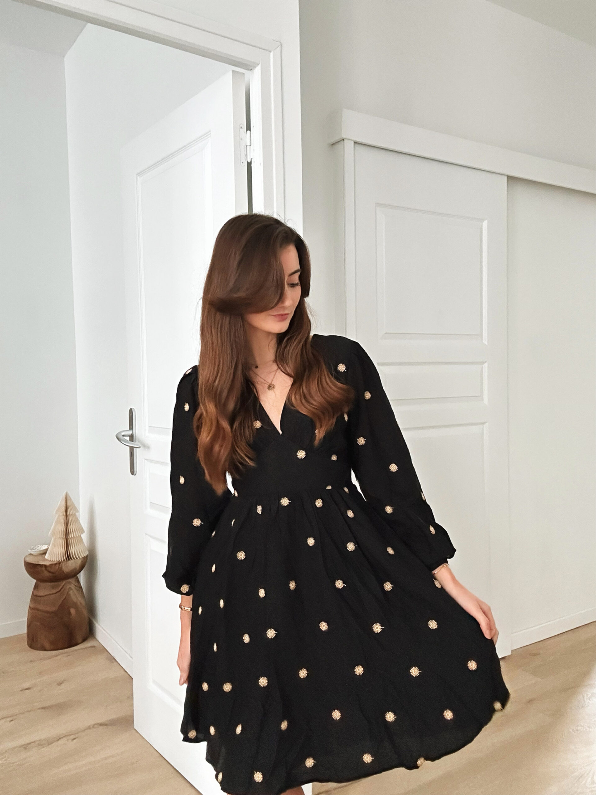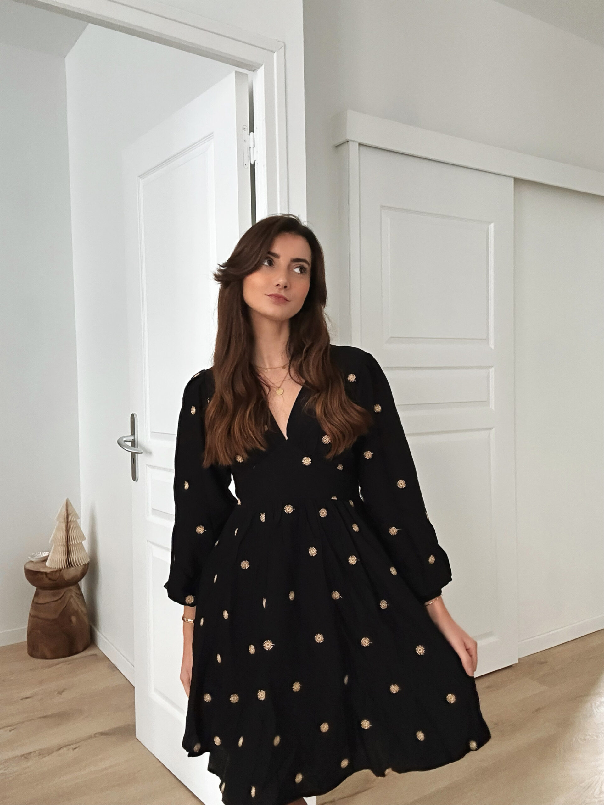 Craquez pour notre robe noire BERTILLE brodée de soleils dorés , décolleté cache-coeur et taille smockée pour une silhouette élégante et confortable. La coupe offre un tombé léger et flatteur, parfait pour le quotidien comme pour une soirée !