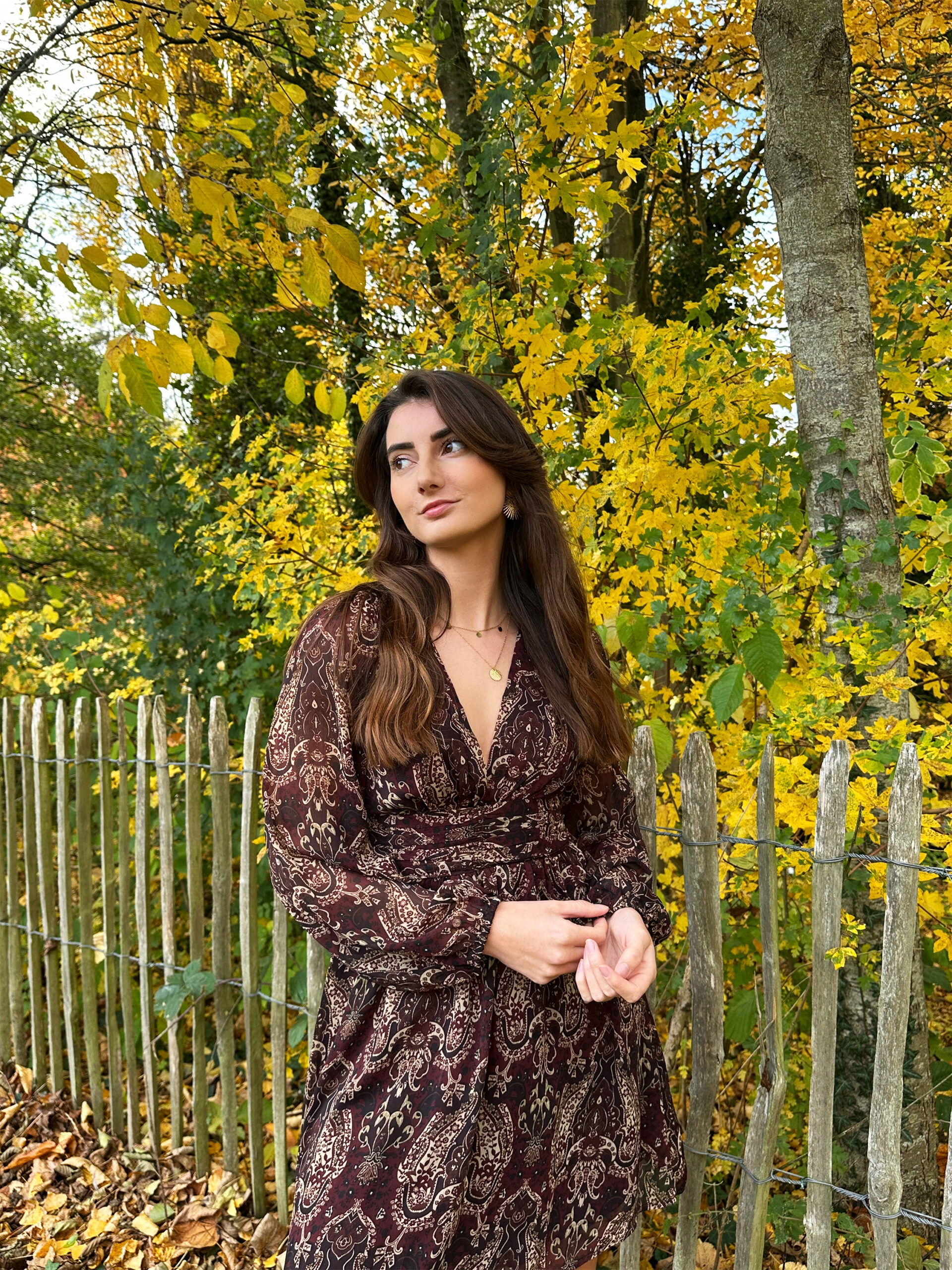 Coup de coeur pour notre nouvelle robe CLÉMENCE ! Une pièce bohème chic aux tons bordeaux, chocolat , écru. Elle saura vous rendre ultra tendance !