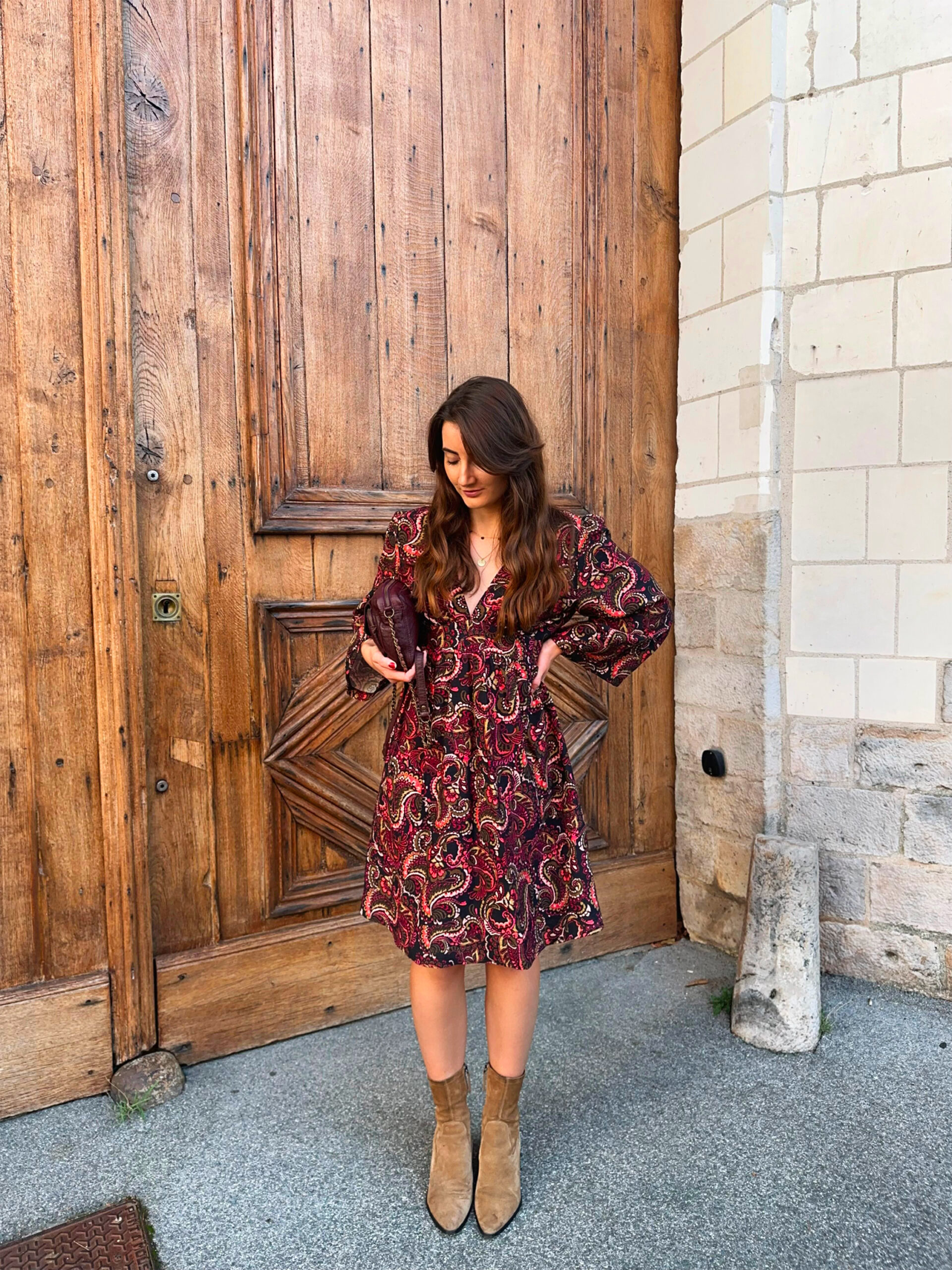 • Joli imprimé automnal avec tons chauds : kaki, camel, rouge et noir