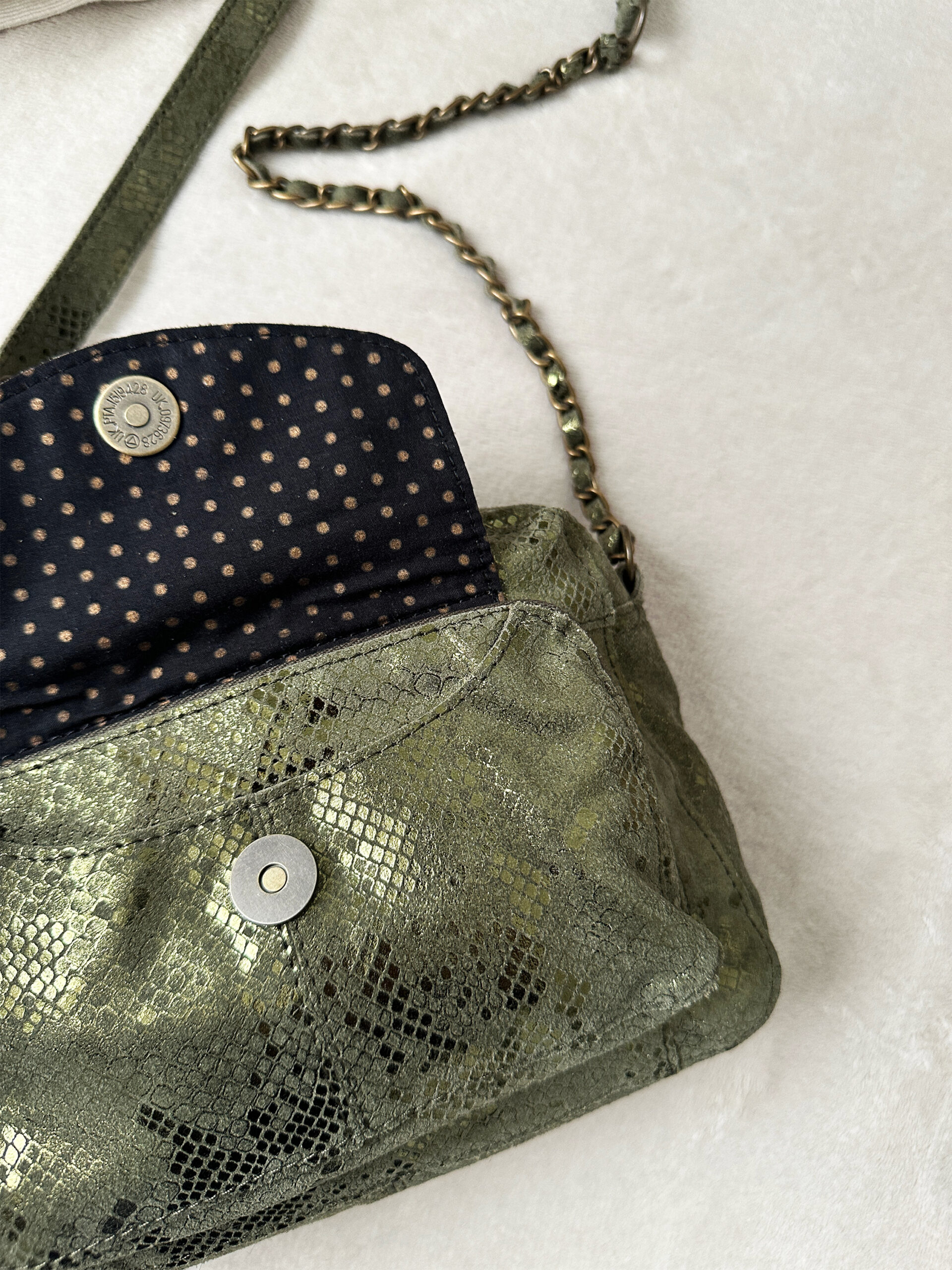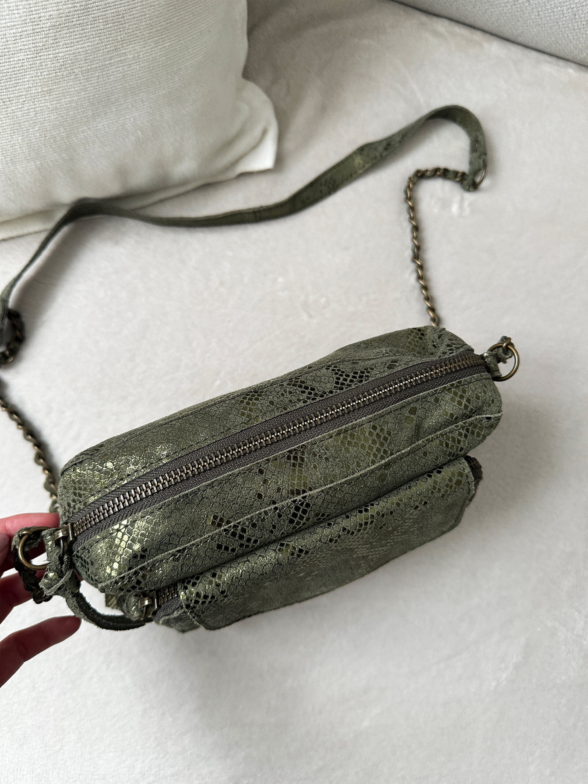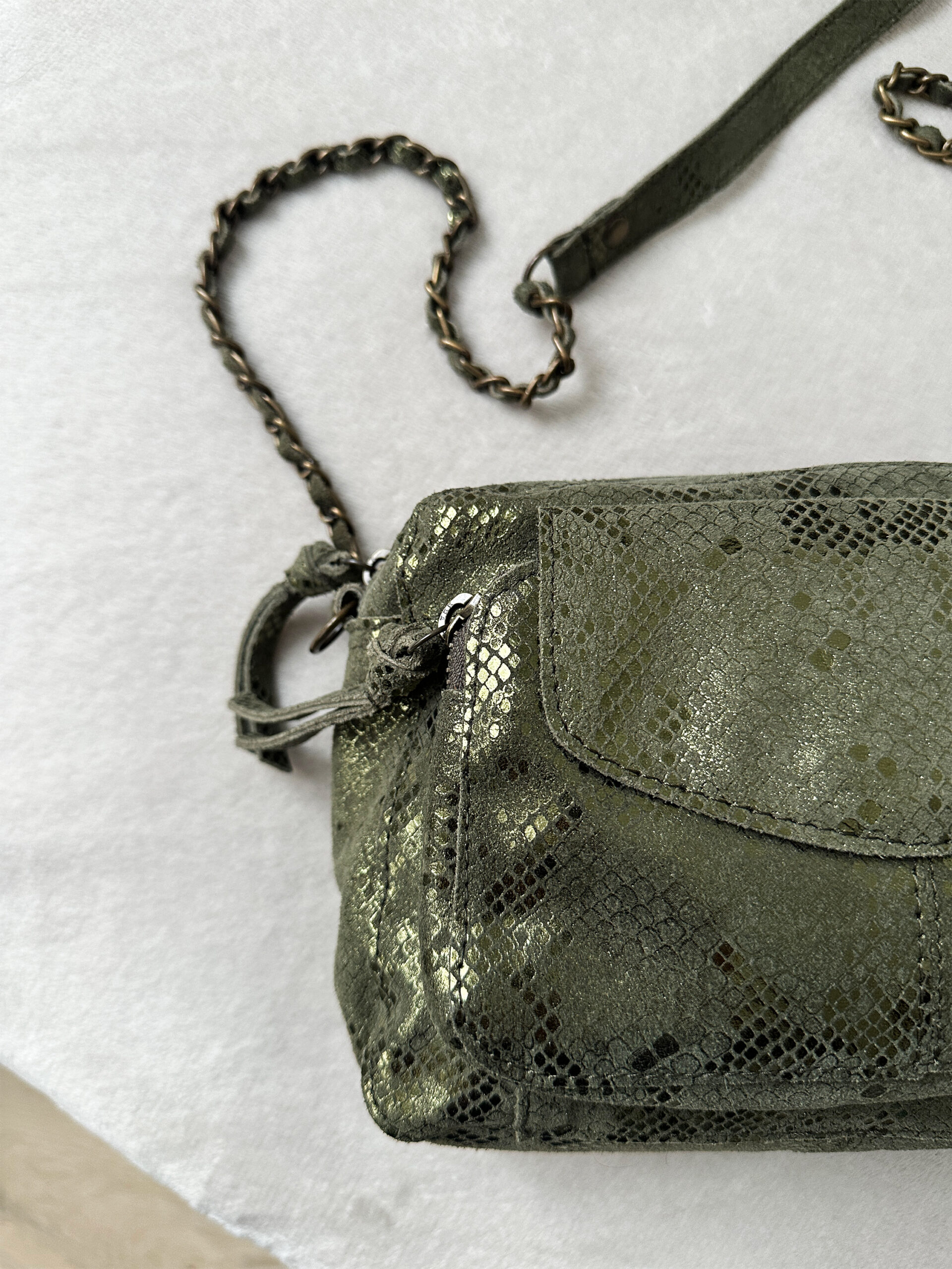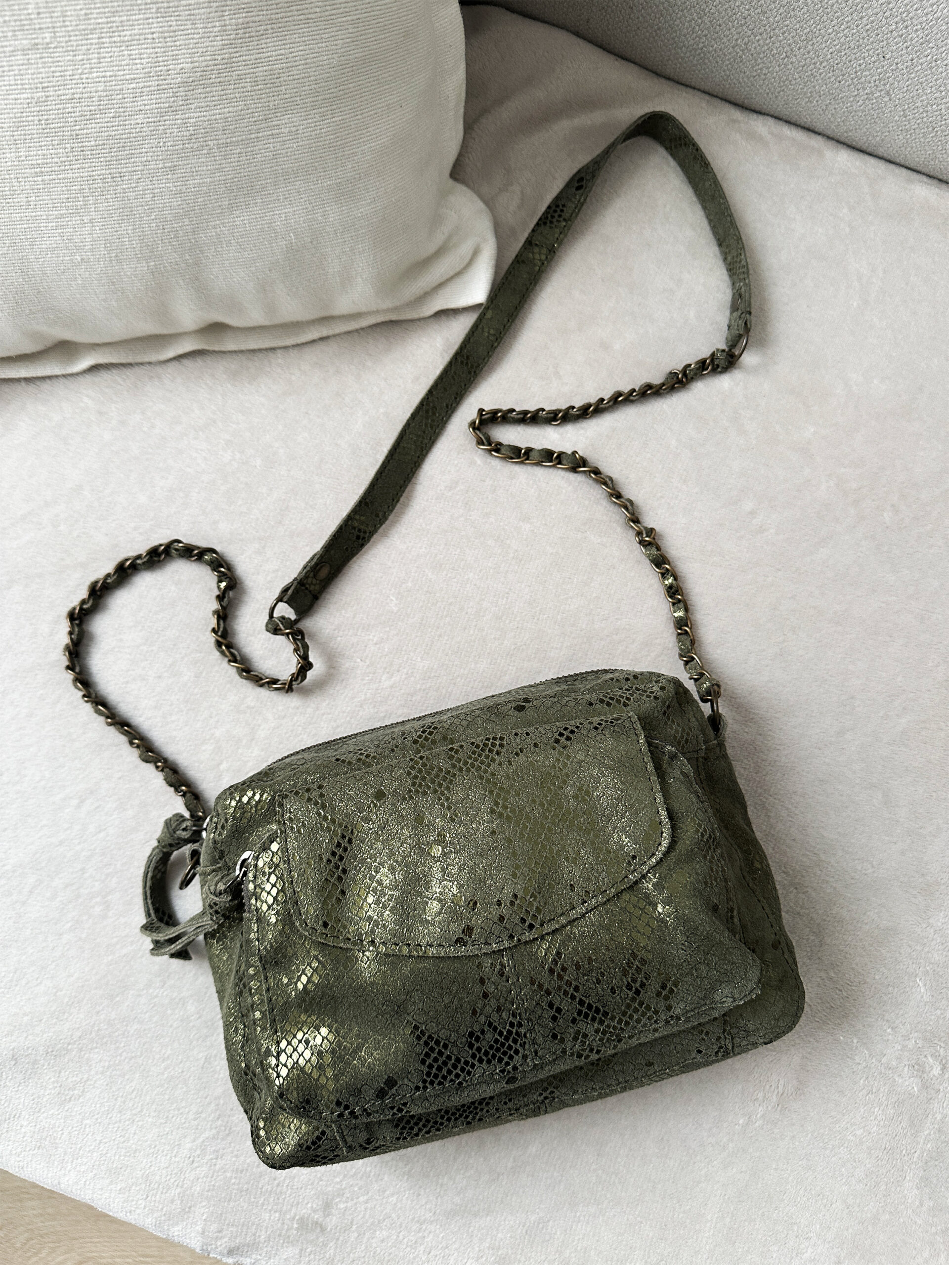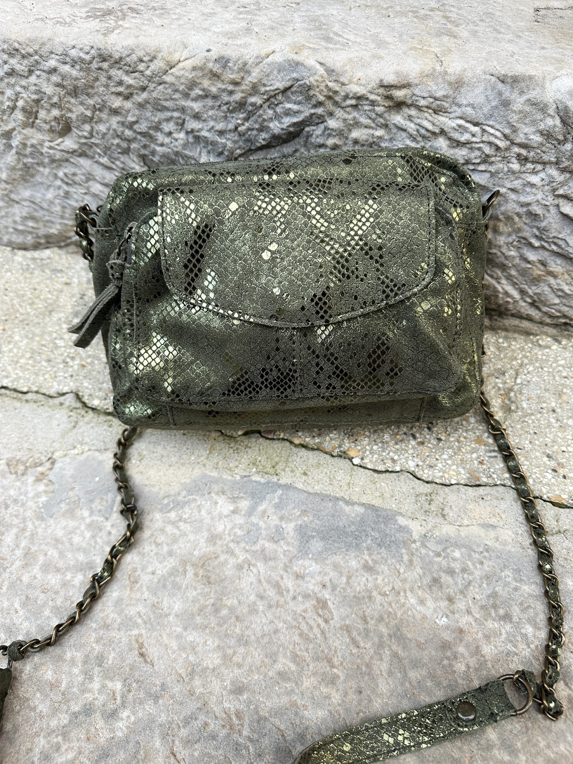 Coup de foudre pour notre sac bandoulière Ines kaki pailleté !